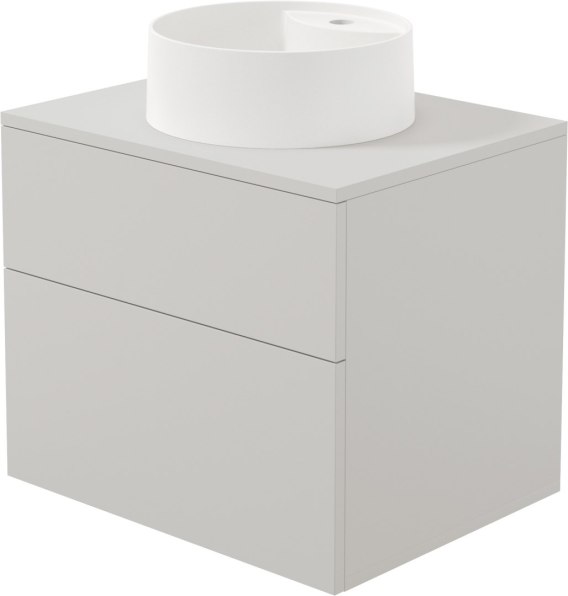 Szafka urzeka minimalistycznym i funkcjonalnym designem. W kaszmirowym wykończeniu to kwintesencja nowoczesnego designu. Dwie pojemne szuflady z pełnym wysuwem i cichym domykiem gwarantują komfort użytkowania, a system otwierania push to open podkreśla jej innowacyjny styl. Lakierowany blat z otworem na syfon został idealnie dopasowany do umywalki nablatowej, tworząc spójną całość.