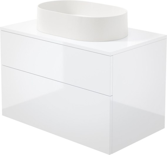 Szafka zachwyca minimalistycznym designem i funkcjonalnością. Wykończona białym, błyszczącym lakierem nadaje wnętrzu nowoczesnego charakteru. Dwie pojemne szuflady z pełnym wysuwem i cichym domykiem gwarantują komfort użytkowania, a system otwierania push to open podkreśla jej innowacyjny styl. Lakierowany blat z otworem na syfon został idealnie dopasowany do umywalki nablatowej, tworząc spójną całość.