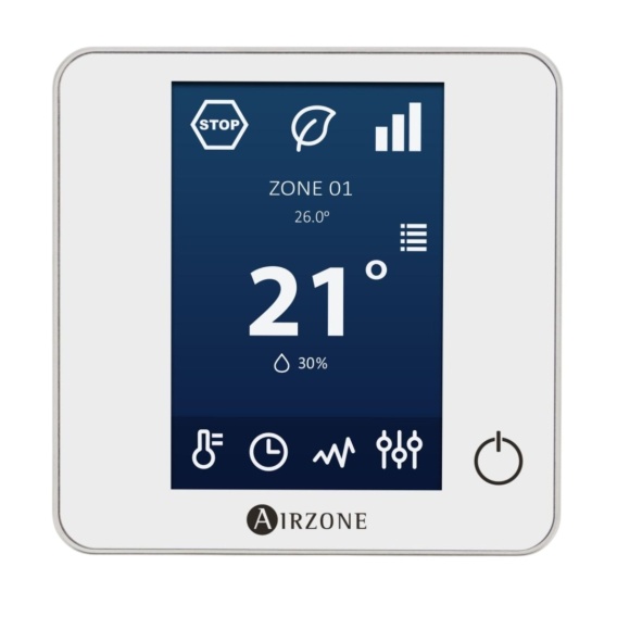 Wykończenie ze stali i szkła, kompaktowe rozmiary i montaż natynkowy sprawiają, że urządzenie idealnie komponuje się z nowoczesnymi wnętrzami. Termostat komunikuje się przewodowo z centralą Airzone, a jego zasilanie odbywa się bezpośrednio z płyty głównej systemu.