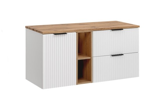Frezowane ryfle pionowe frontów nadają meblom wyjątkowego charakteru, a dostępność różnych kolorów uchwytów - od złotego połysku, przez czarny mat, po chrom - pozwala na stworzenie idealnego dopasowania do Twojego wnętrza.