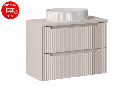 Zestaw składa się z trzech elementów: szafki pod umywalkę, blatu oraz umywalki nablatowej. Dzięki szerokości 80cm, z łatwością zmieścisz wszystkie niezbędne produkty higieniczne. Kolor kaszmirowy mat sprawia, że zestaw prezentuje się nowocześnie i subtelnie.