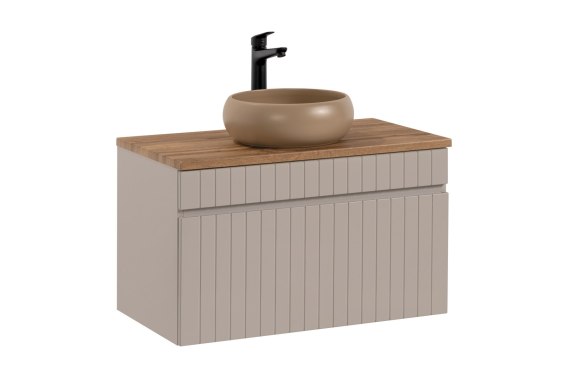 Blat o szerokości 80cm w kolorze Dąb Coast Evoke stanowi solidną podstawę dla umywalki nablatowej Wiki, która dodaje elegancji i stylu całej kompozycji. Fronty ze strukturą frezowanych ryfli pionowych nadają meblom unikalny charakter, natomiast uchwyty w kolor